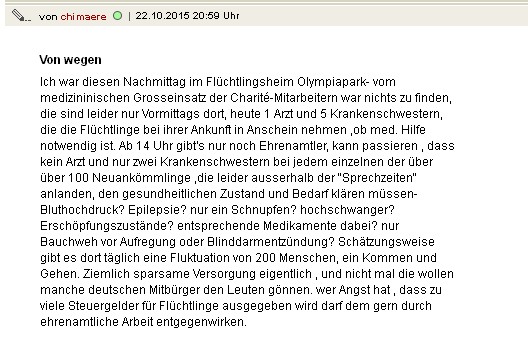 Auch wenn in Rundschreiben Gegenteiliges gefordert wird. Für die mehr als 4.500 Schutzbedürftigen, die den Olympiapark mittlerweile passiert haben, wurde in den vergangenen Wochen NOCH NIEMALS auch nur ein einziger "grüner Krankenschein" vom zuständigen Amt (LaGeSo) ausgestellt. Man verlässt sich auf die Rettungsstellen, den öffentlichen Notarztdienst und den selbst organisierten "good will". - Ja, das funktioniert. Allerdings lauten die Vorgaben eben anders. Sonst ist man ja auch sehr pingelig.
